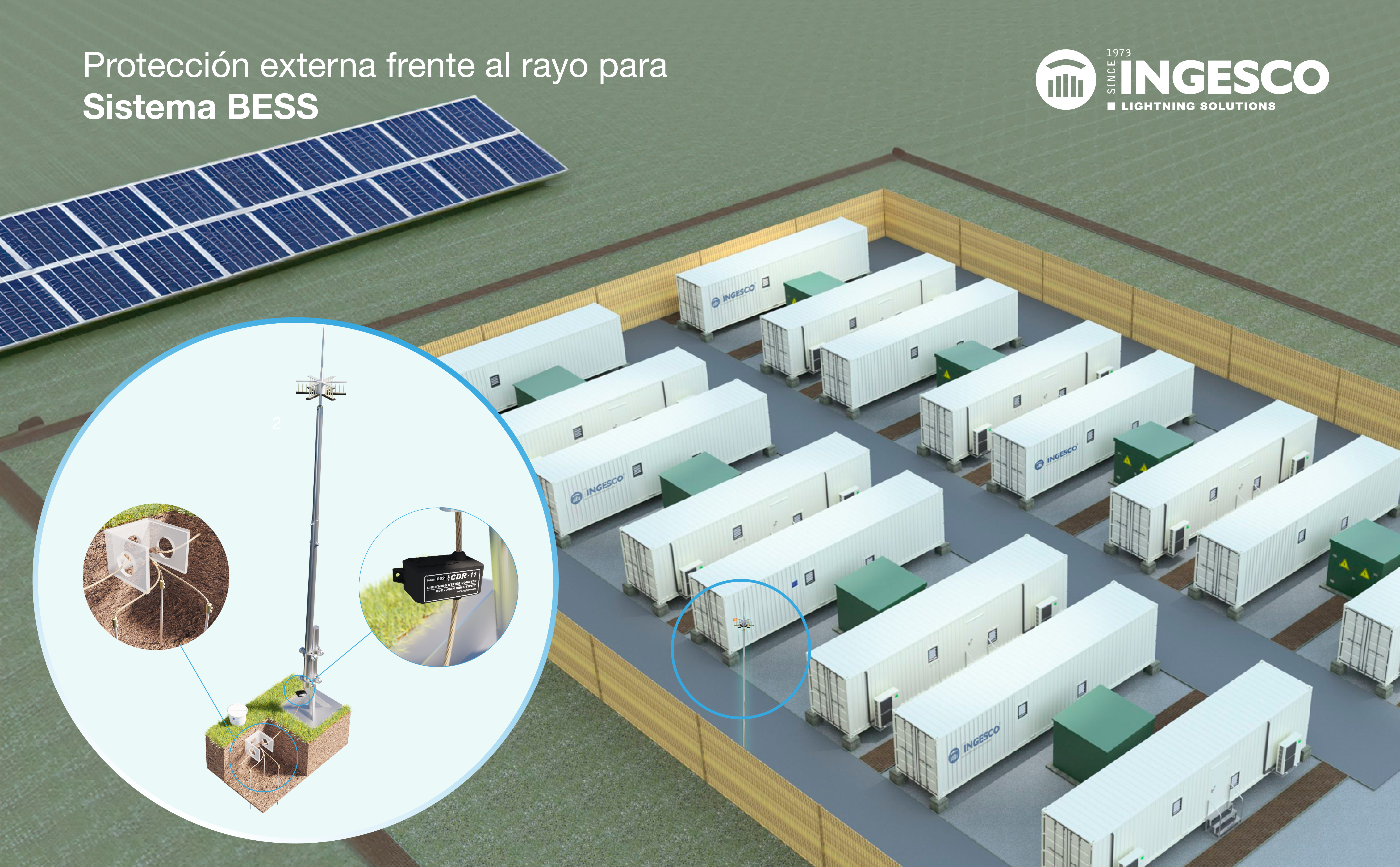 Los sistemas BESS contienen componentes electrónicos críticos, como convertidores de potencia y sistemas de gestión de baterías (BMS), que son altamente sensibles a las sobretensiones y descargas directas de rayos.
